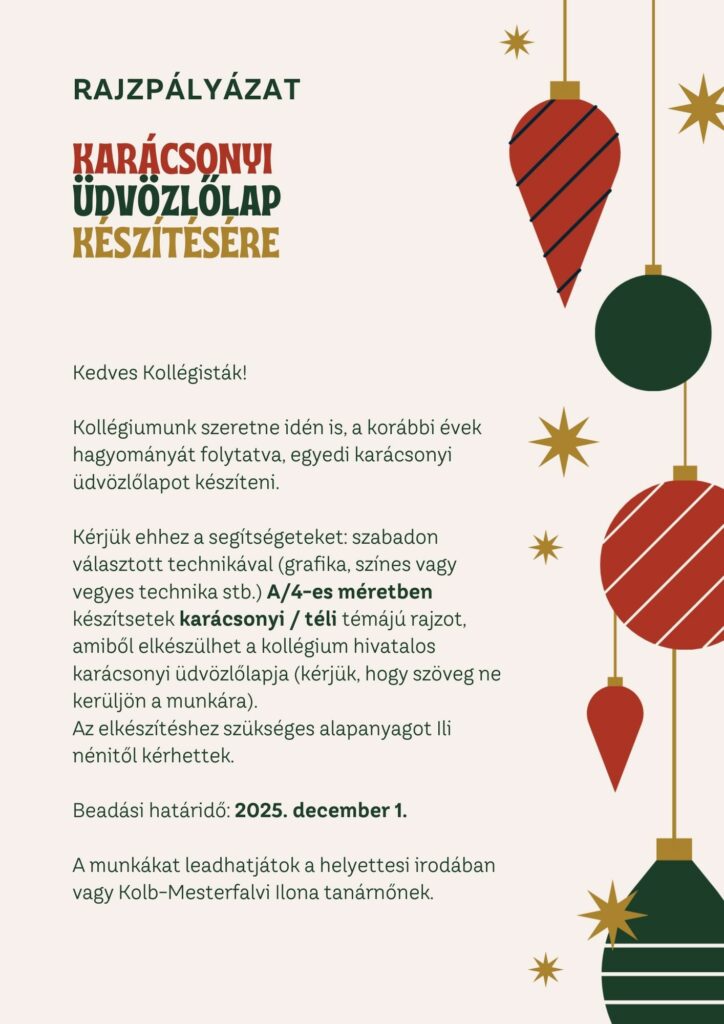 Karácsonyi képeslap készítő pályázat Hegedűs László 2025-11-24 Hírek Többes számú: 0 Hozzászólás Kedves Kollégisták! Karácsonyi képeslap készítő pályázatunk idén újra elindul! A részleteket az alábbi képen olvashatjátok! Bejegyzés navigáció Previous Previous post: Sikeres szereplés a pécsi Ciszterci Kollégium Istenes versek versmondó versenyén Vélemény, hozzászólás? Kilépés a válaszbólAz e-mail-címet nem tesszük közzé. A kötelező mezőket * karakterrel jelöltükHozzászólás Név * E-mail cím * Honlap A nevem, e-mail-címem, és weboldalcímem mentése a böngészőben a következő hozzászólásomhoz.