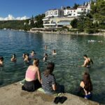 Utunkat ezután Vrbnik felé vettük, egy kellemes, gyönyörű kisvárosba, ahol tettünk egy sétát. Gyönyörködtünk az elénk táruló látványban: a tenger, a sziklák, a dús zöld minden diákot fotózásra, szelfizésre, posztolásra ösztönzött. Sikeresen átsétáltunk a város egyik nevezetességén, egy igen szűk utcán, mely szélességében nincs 50 cm sem. Mogyorósi Tamás nagyon sok érdekes információval szolgált a gyerekeknek. A séta végén lementünk a városhoz tartozó kisebb, de annál hangulatosabb tengerpartra, amelynek egy részén sziklákról lehet fejest ugrani. A vakmerőbb fiúk azonnal éltek is a lehetőséggel, nem kis félelmemre a legelején, de hamar meggyőződhettem róla, hogy arról a pontról, amelyről mások is ugráltak, teljesen biztonságos a vízbe érkezés. Páran kissé el voltak fáradva, így ők csak a partról nézték a fürdőzőket. Számos jó képet sikerült itt is egyénileg és csoportosan is csinálni. Bő egy óra múlva visszamentünk az autóbuszhoz, és 16 óra körül Kraljevicára értünk. Vacsoráig jópár diákom ki sem jött a tengerből, így gyakorlatilag a nap jó részét a vízben töltötték a különböző strandokon. Elmondásuk szerint mindegyik strand nagyon tetszett nekik, más-más okból. Már azt kezdték tervezgetni, hogy az érettségi után páran lejönnek együtt autóval.