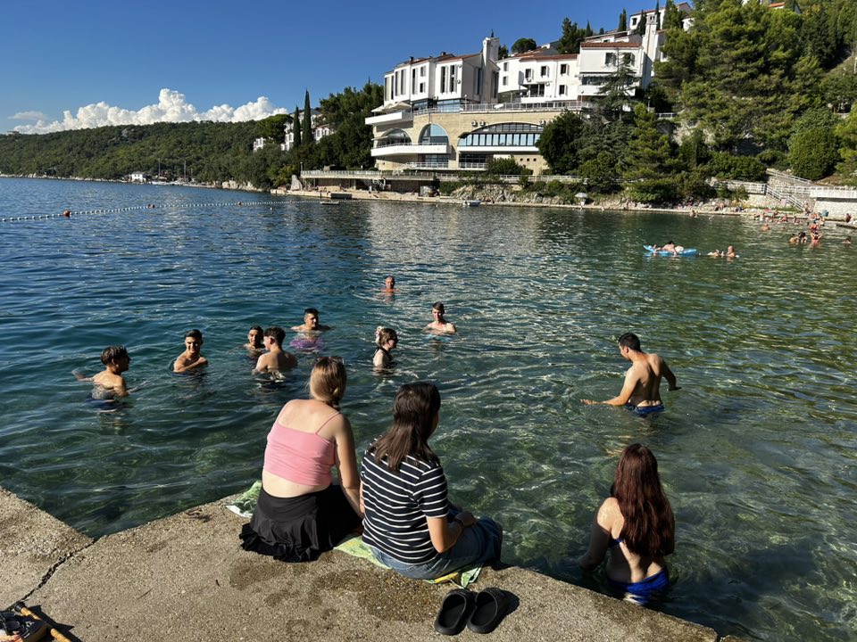 Buszunkra felszállva a gyerekek elfogyasztották maradék szendvicseiket, és egy óra múlva megérkeztünk Kraljevicára, az Uvala Scott Hotelbe, amely két napig a szállásunk volt. Szobáinkat elfoglalva hamar le is mentünk a tengerpartra. Körülbelül a fele csoportom nem volt még a tengernél, így hatalmas élmény volt ez sokaknak. A bátrabbak azonnal vízbe mentek, a fiúk fejeseket ugrottak, a lányok szolídan úszkáltak vagy sétáltak a kellemes vízben, illetve napoztak.