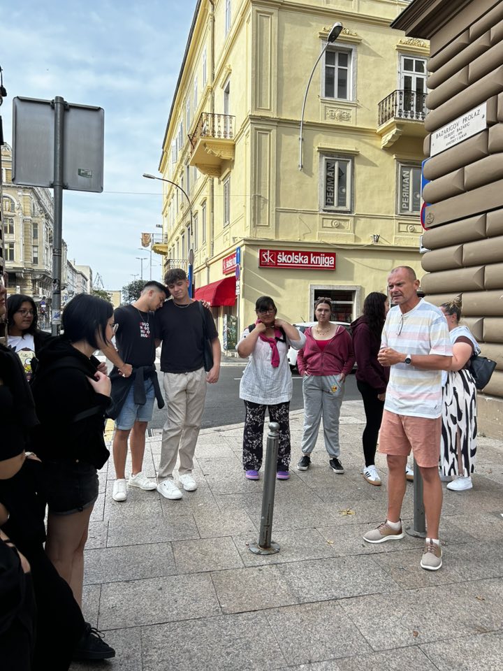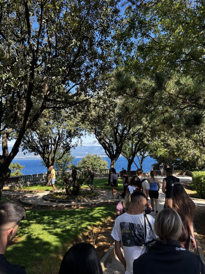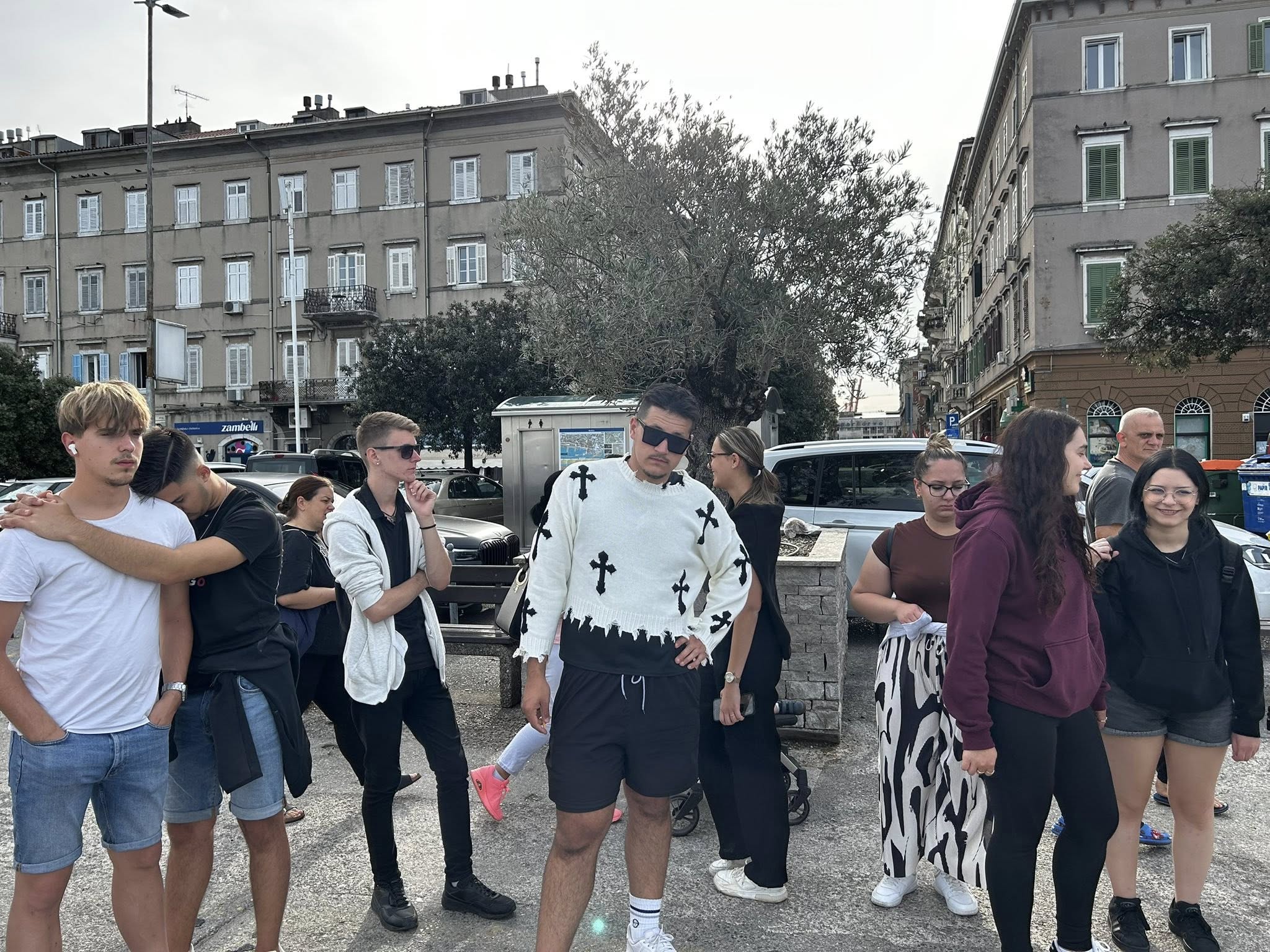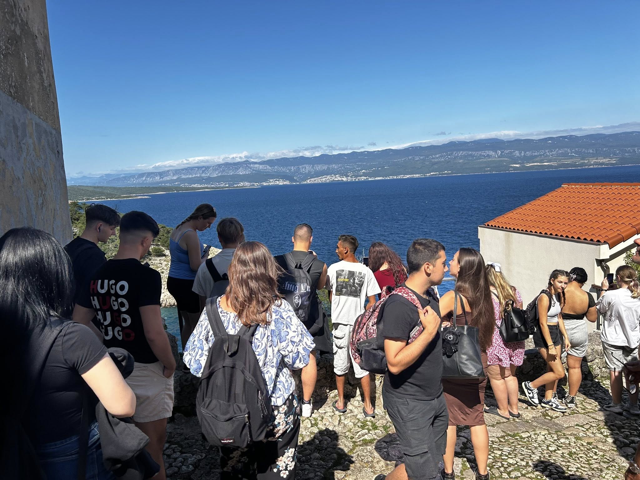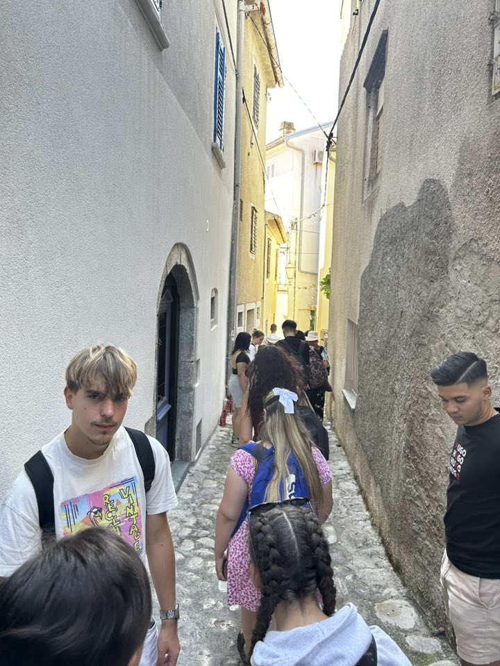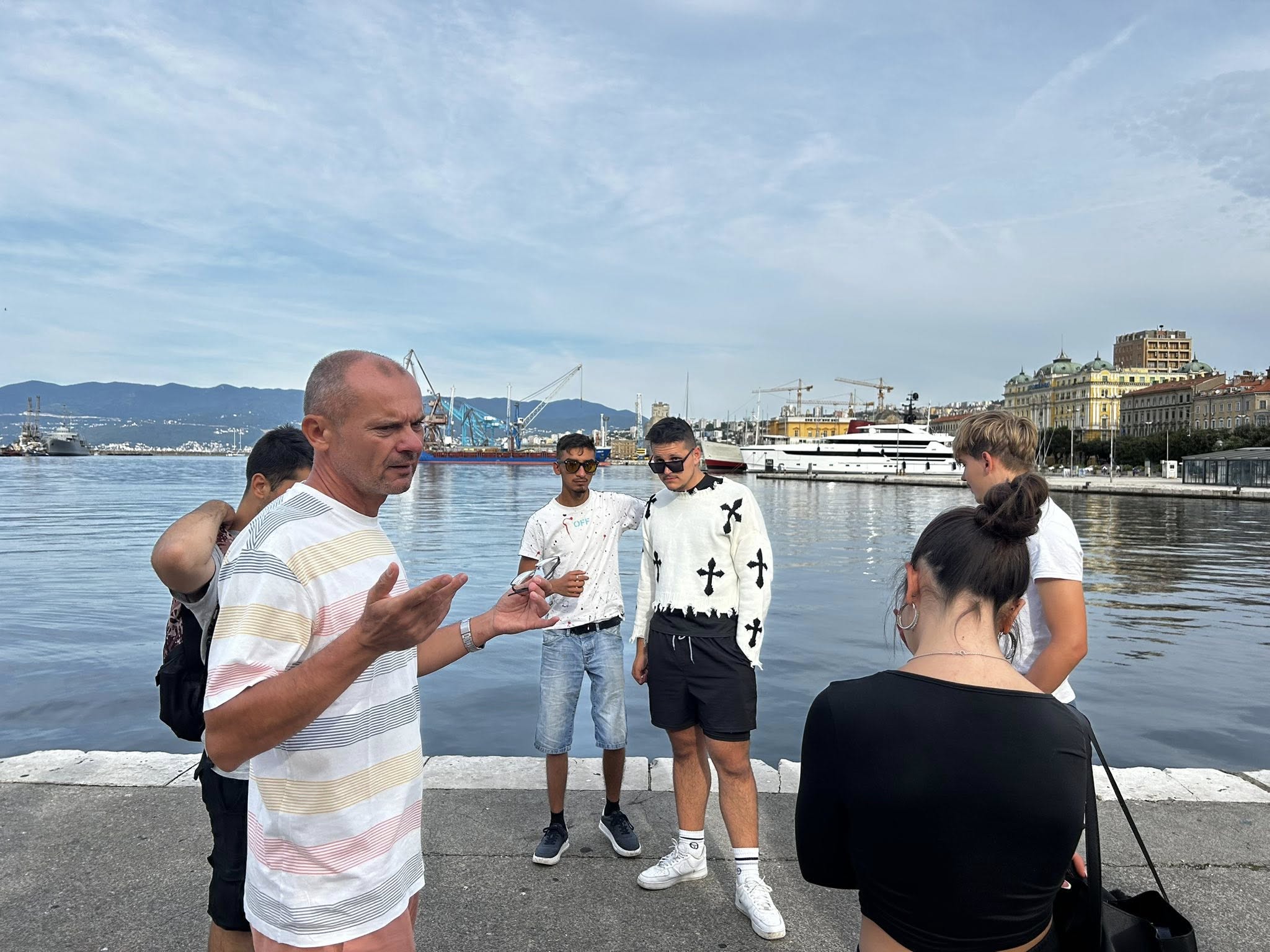 A csoport egy része a második éjszakázás miatt igencsak fáradt volt, ennek ellenére izgalommal várták, hogy megismerhessük Fiumét. Jó kis városi séta után elérkeztünk az alagúthoz, ahova be szerettünk volna jutni, azonban a helyszínen kiderült, hogy kizárólag kártyás fizetés lehetséges, nálunk azonban csak készpénz volt. Kollégám kiváló horvát nyelvtudásával próbálta elérni, hogy hadd mehessünk be az euróinkkal az alagútba, de nem lehetett. Sajnos ezt a programpontot így törölni kellett. A kihagyott program miatt lett a gyerekeknek egy kis szabadidejük, amit mindig nagyon szeretnek. Azonban mi módjával osztogatjuk ezt a külföldi városokban, nehogy eltévedjenek véletlenül. A megbeszélt időpontra mindenki visszaért, és folytattuk a városi sétát. Több száz lépcsőn vezetett fel utunk a középkori Trsat kastélyba. Voltak, akik nagyon ügyesen és gyorsan felértek a lépcsősor tetejére. Én mindig a legutolsókkal maradok, hogy bíztassam őket is és magamat is, hogy már nem sok van hátra. Csodálatos helyszínre érkeztünk, ahol azonnal csoportképet is készítettünk. Mogyorósi Tamás sok érdekességet mesélt a diákoknak, majd mindenki egyenként felfedezhette ezt a különleges várkastélyt. Akik nem voltak fáradtak vagy lusták, felsétáltak a bástyára, ahonnan csodás panoráma tárul az ember szeme elé. A csoport felén ekkor már sajnos azt érzékeltük, hogy inkább pihengetnek a hűs betonpadokon, minthogy valamelyest bejárnák és felfedeznék a helyszínt. A megbeszélt időpontban a bejárathoz érkezett mindenki, és indultunk fagyizni. Mindenki választhatott magának, melyik ízből kéri a fejenkénti két gombócot. Igazán jólesett a koraőszi melegben is az isteni hideg fagylalt. Ezután felszálltunk buszunkra, és megkezdtük a hazautazást.