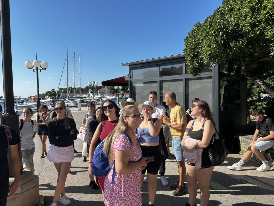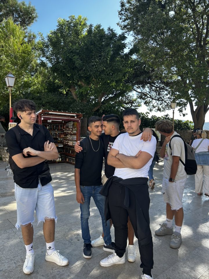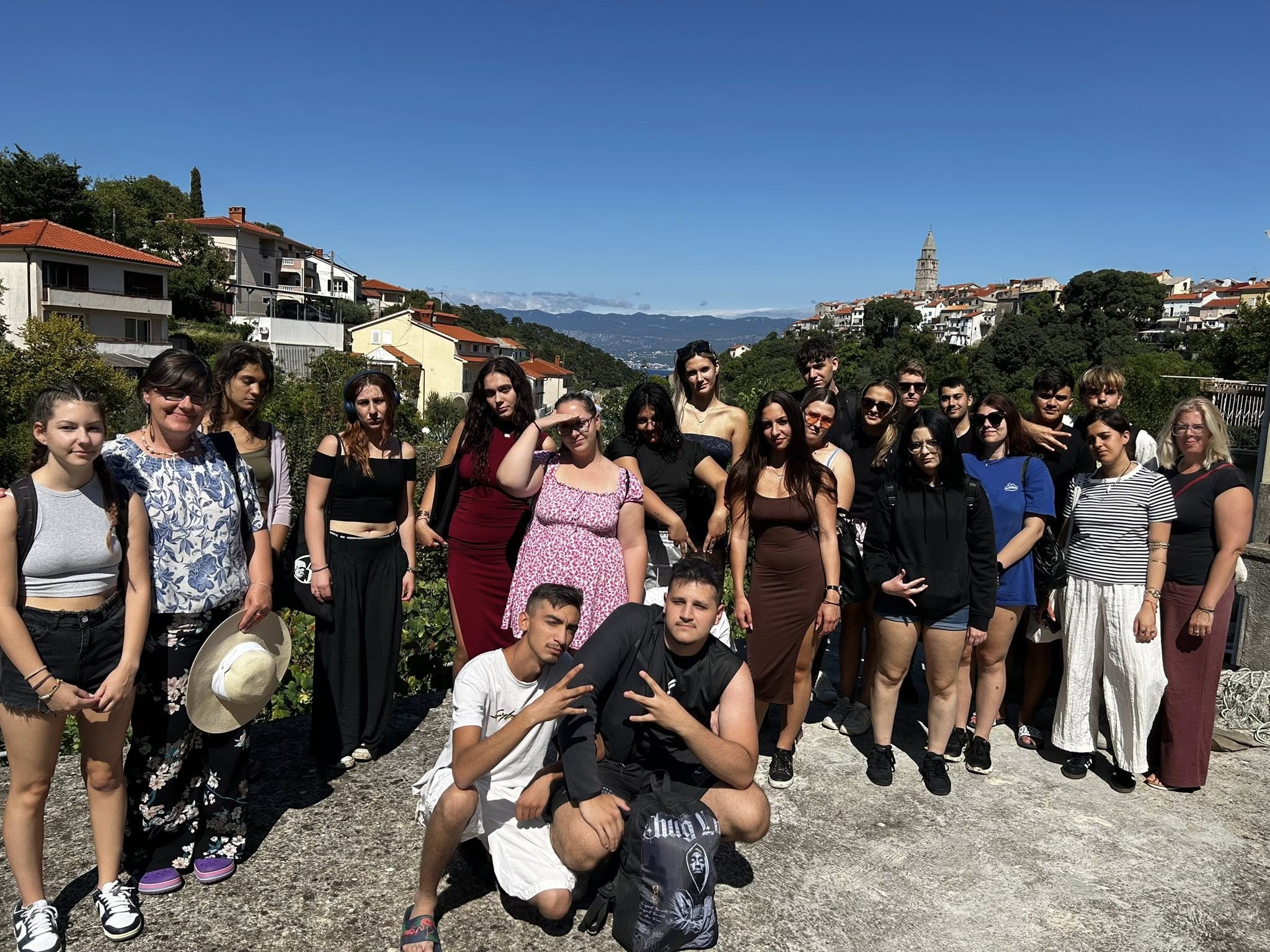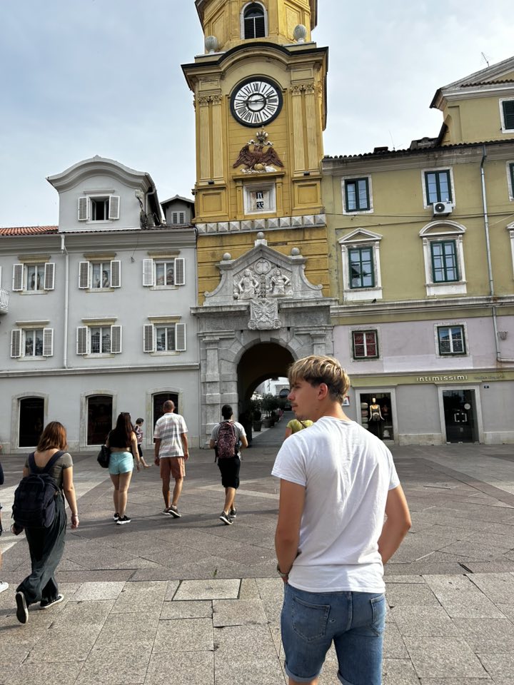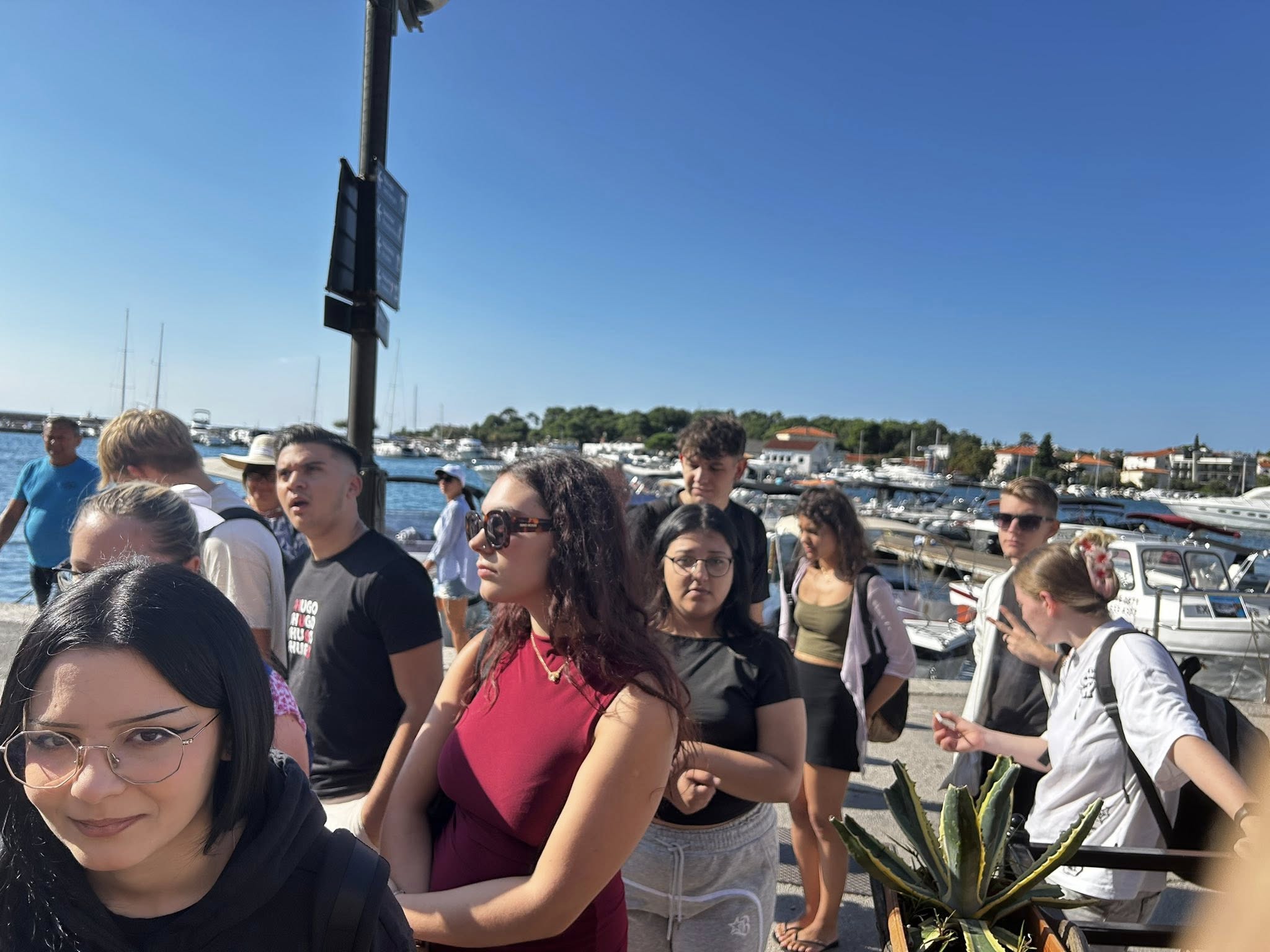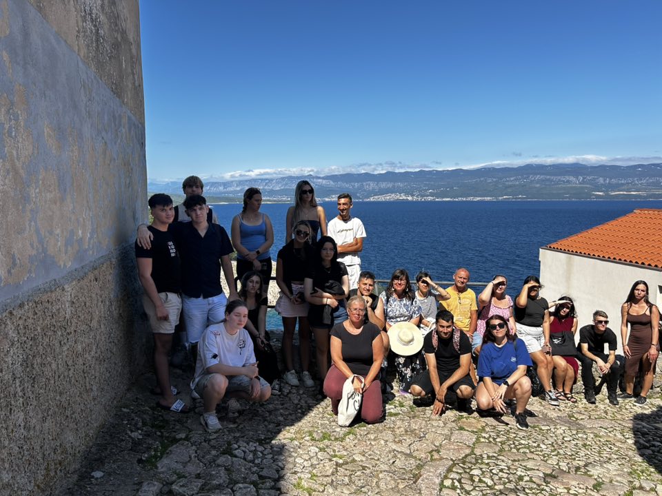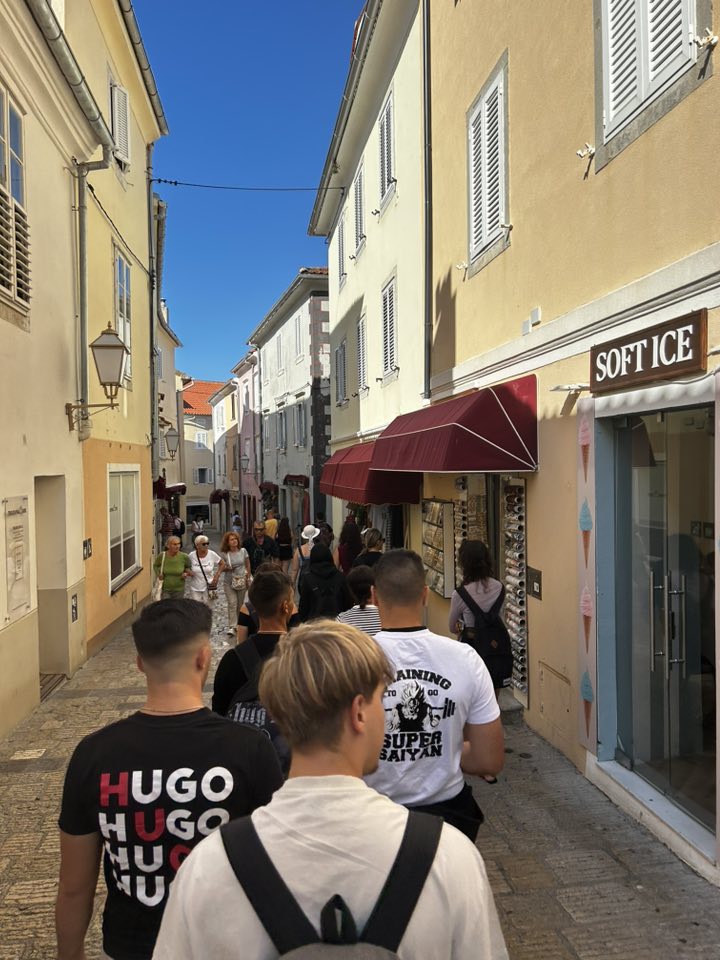A csoport egy része a második éjszakázás miatt igencsak fáradt volt, ennek ellenére izgalommal várták, hogy megismerhessük Fiumét. Jó kis városi séta után elérkeztünk az alagúthoz, ahova be szerettünk volna jutni, azonban a helyszínen kiderült, hogy kizárólag kártyás fizetés lehetséges, nálunk azonban csak készpénz volt. Kollégám kiváló horvát nyelvtudásával próbálta elérni, hogy hadd mehessünk be az euróinkkal az alagútba, de nem lehetett. Sajnos ezt a programpontot így törölni kellett. A kihagyott program miatt lett a gyerekeknek egy kis szabadidejük, amit mindig nagyon szeretnek. Azonban mi módjával osztogatjuk ezt a külföldi városokban, nehogy eltévedjenek véletlenül. A megbeszélt időpontra mindenki visszaért, és folytattuk a városi sétát. Több száz lépcsőn vezetett fel utunk a középkori Trsat kastélyba. Voltak, akik nagyon ügyesen és gyorsan felértek a lépcsősor tetejére. Én mindig a legutolsókkal maradok, hogy bíztassam őket is és magamat is, hogy már nem sok van hátra. Csodálatos helyszínre érkeztünk, ahol azonnal csoportképet is készítettünk. Mogyorósi Tamás sok érdekességet mesélt a diákoknak, majd mindenki egyenként felfedezhette ezt a különleges várkastélyt. Akik nem voltak fáradtak vagy lusták, felsétáltak a bástyára, ahonnan csodás panoráma tárul az ember szeme elé. A csoport felén ekkor már sajnos azt érzékeltük, hogy inkább pihengetnek a hűs betonpadokon, minthogy valamelyest bejárnák és felfedeznék a helyszínt. A megbeszélt időpontban a bejárathoz érkezett mindenki, és indultunk fagyizni. Mindenki választhatott magának, melyik ízből kéri a fejenkénti két gombócot. Igazán jólesett a koraőszi melegben is az isteni hideg fagylalt. Ezután felszálltunk buszunkra, és megkezdtük a hazautazást.