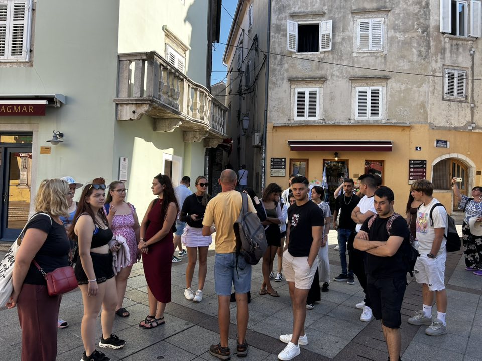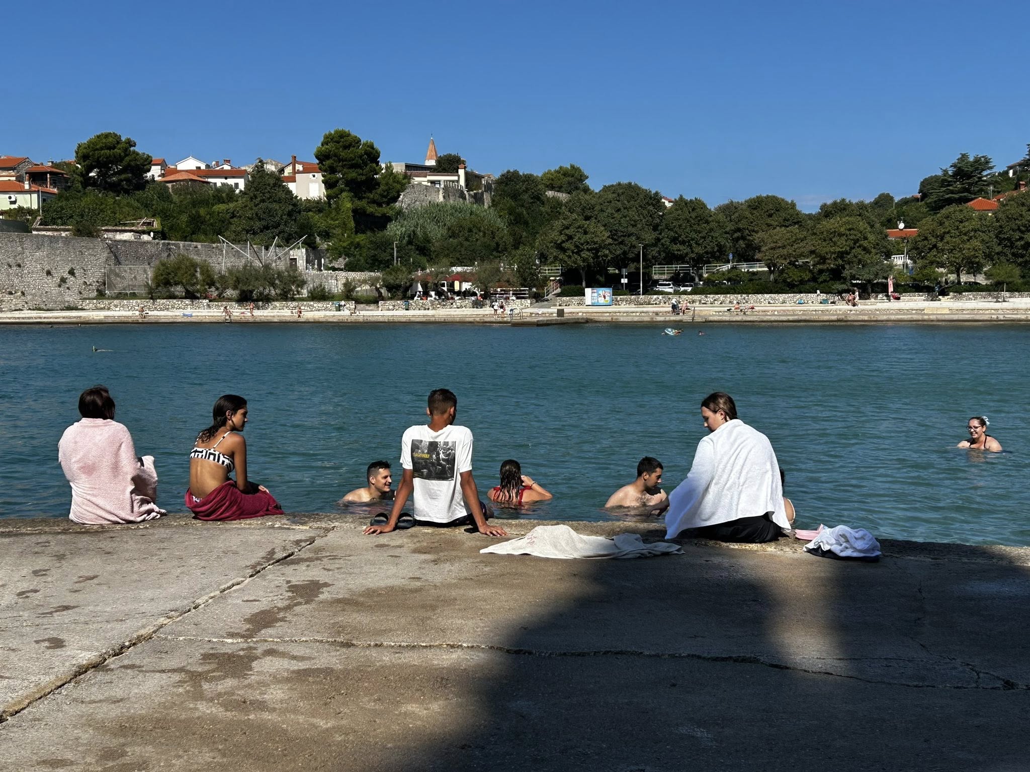 Másnap már 7 órakor lementünk reggelizni, hogy időben el tudjunk indulni Krk városába. Mindössze háromnegyed óra buszozás után meg is érkeztünk úti célunkhoz. Először egy kisebb városi sétát tettünk, majd lementünk a Portopisana strandhoz, ahol a diákok jó része élvezettel vetette bele magát a kellemes vízbe. Úszkáltak, játszottak, beszélgettek, napoztak. Páran még visszamentek a városba szuveníreket venni, pár gombóc fagyit megenni. A megbeszélt időpontban jött értünk az autóbusz, és egy „Plodinében” volt lehetőségük a diákoknak ételt, italt és édességet vásárolniuk.