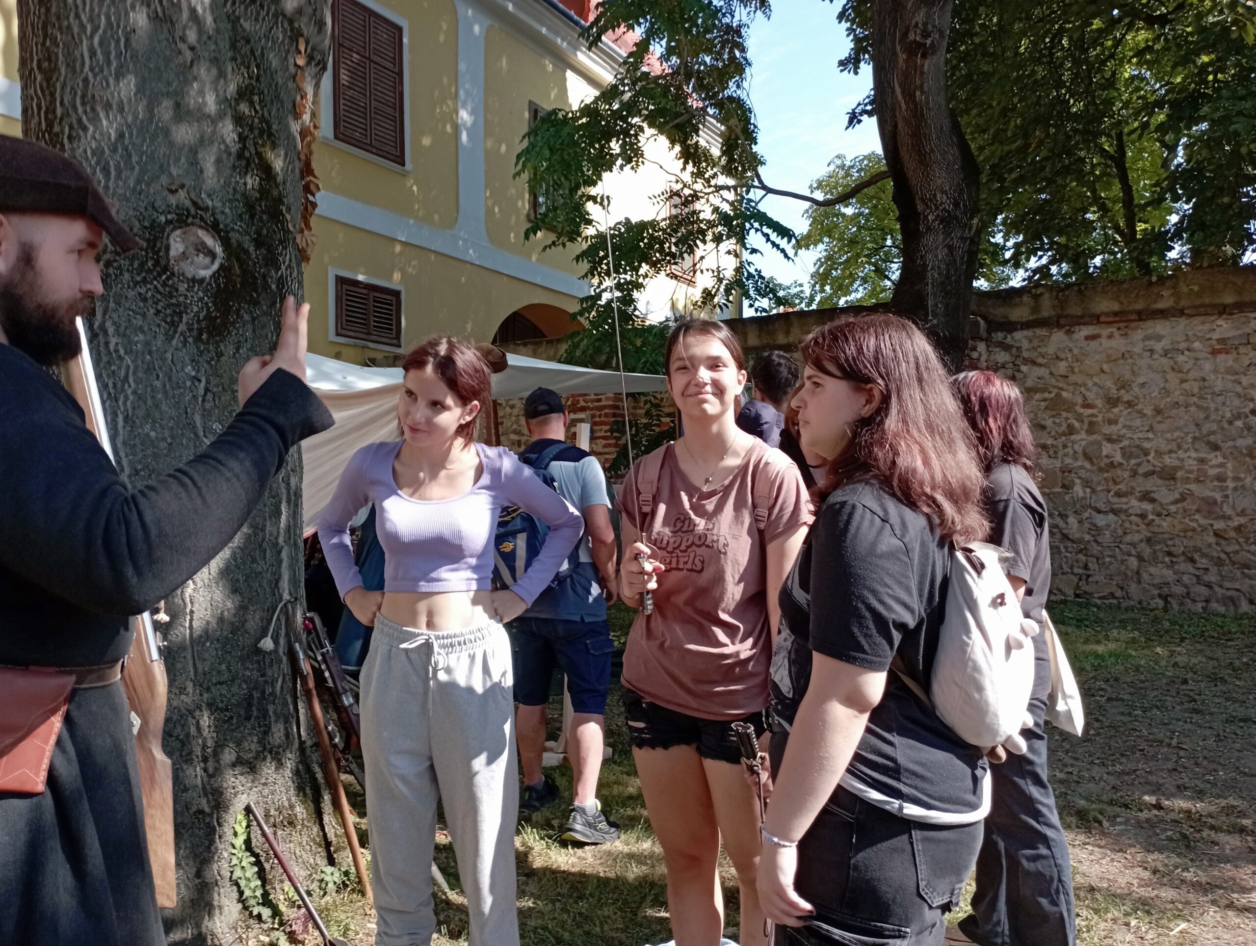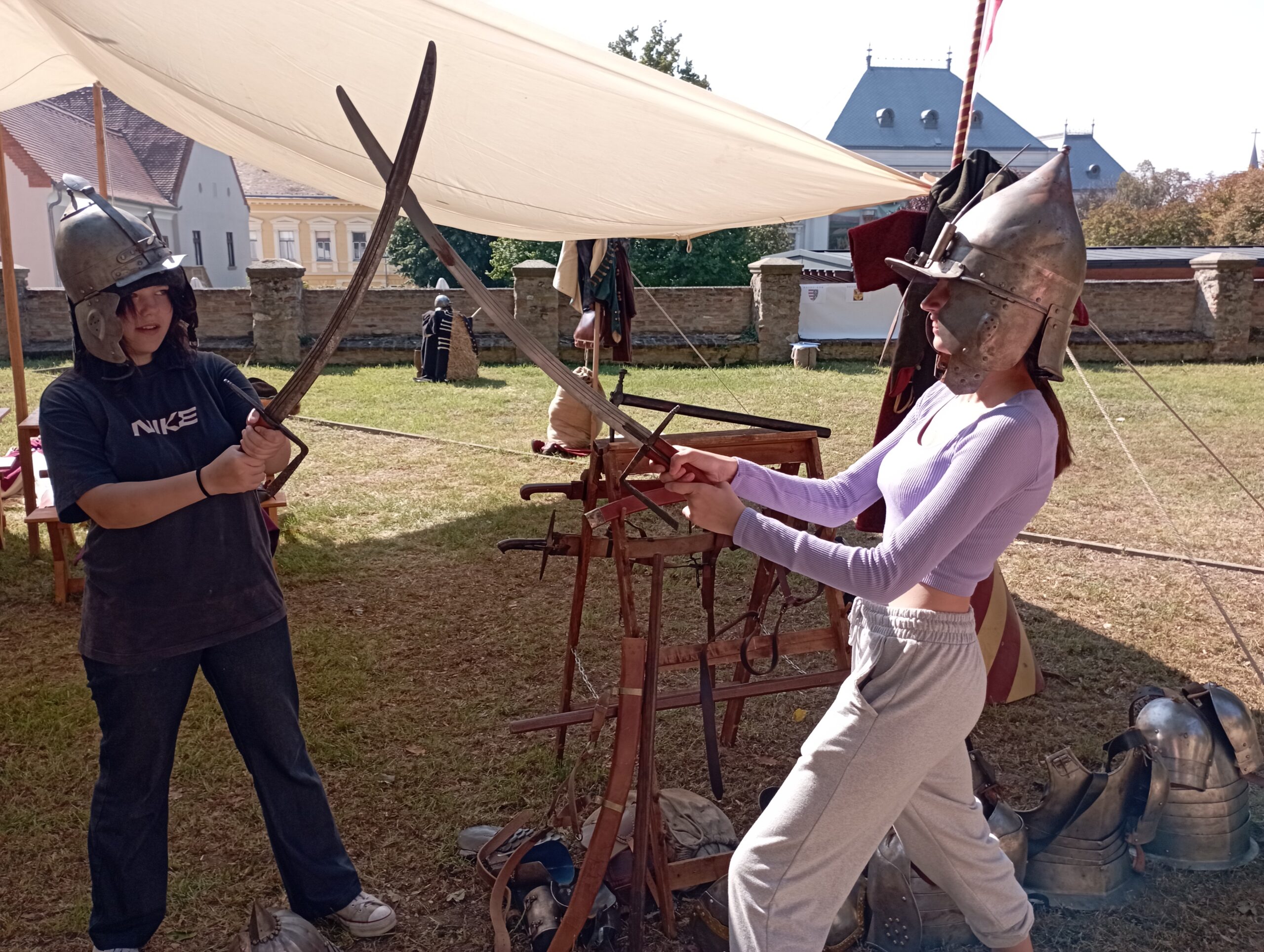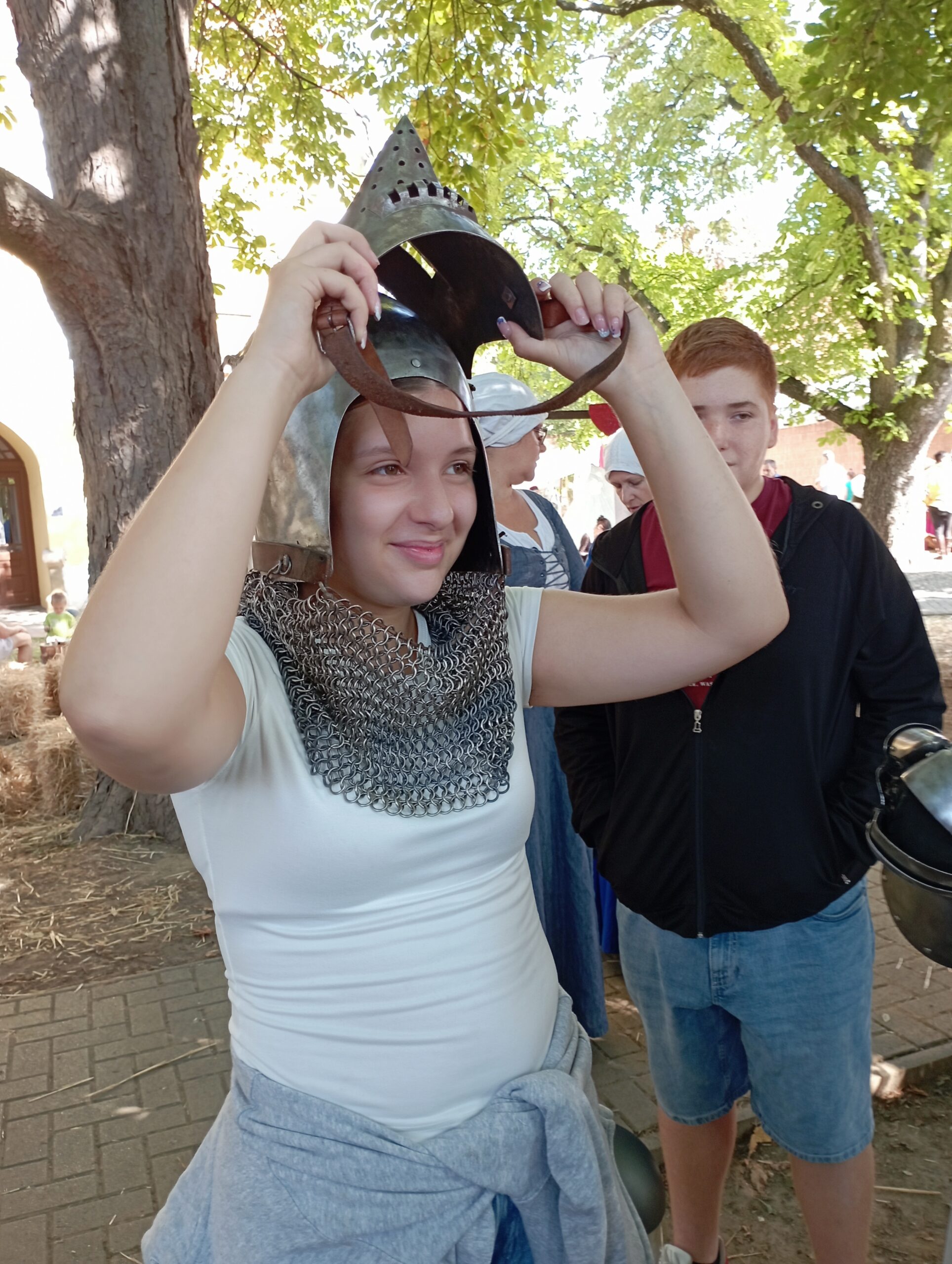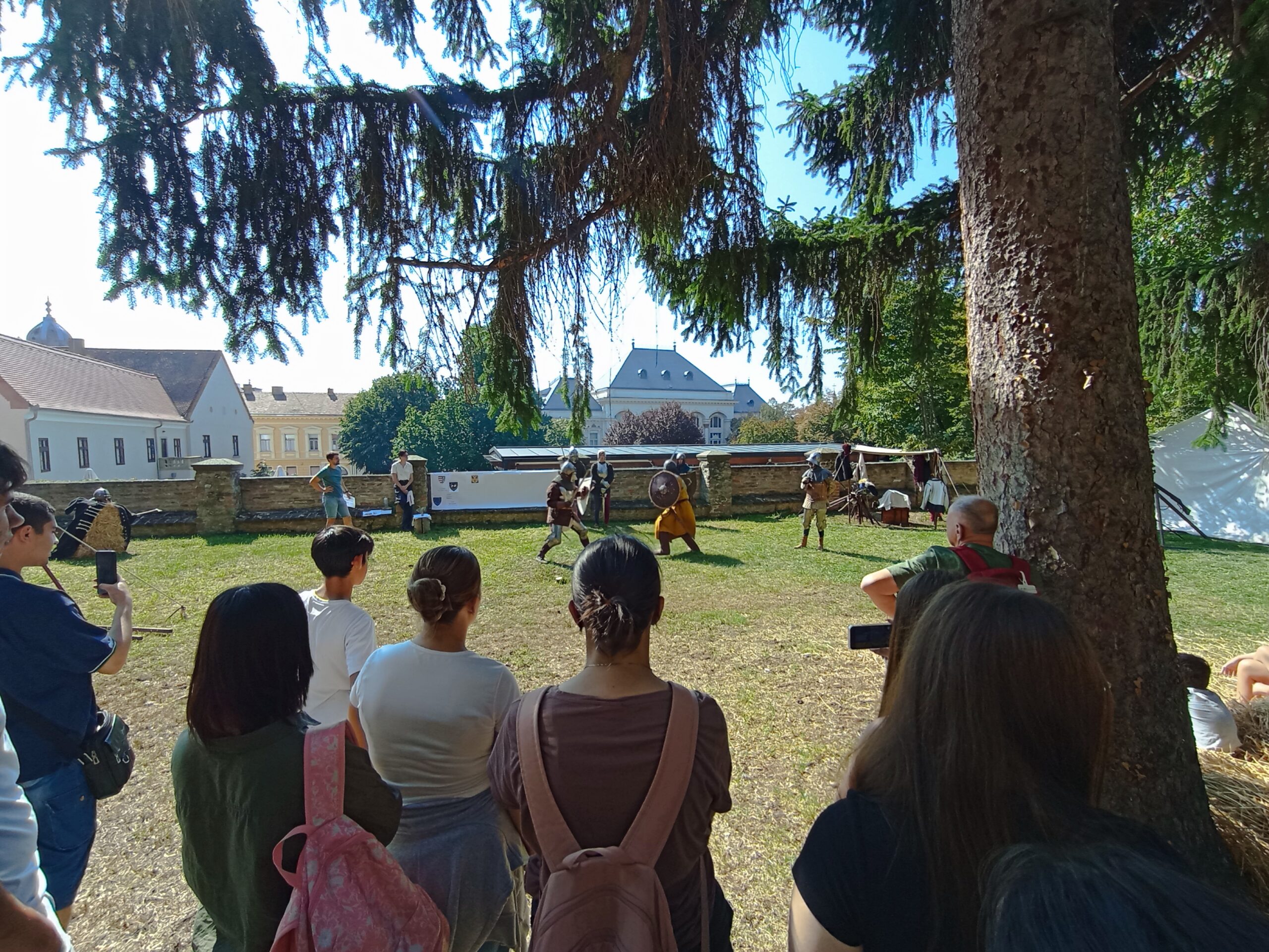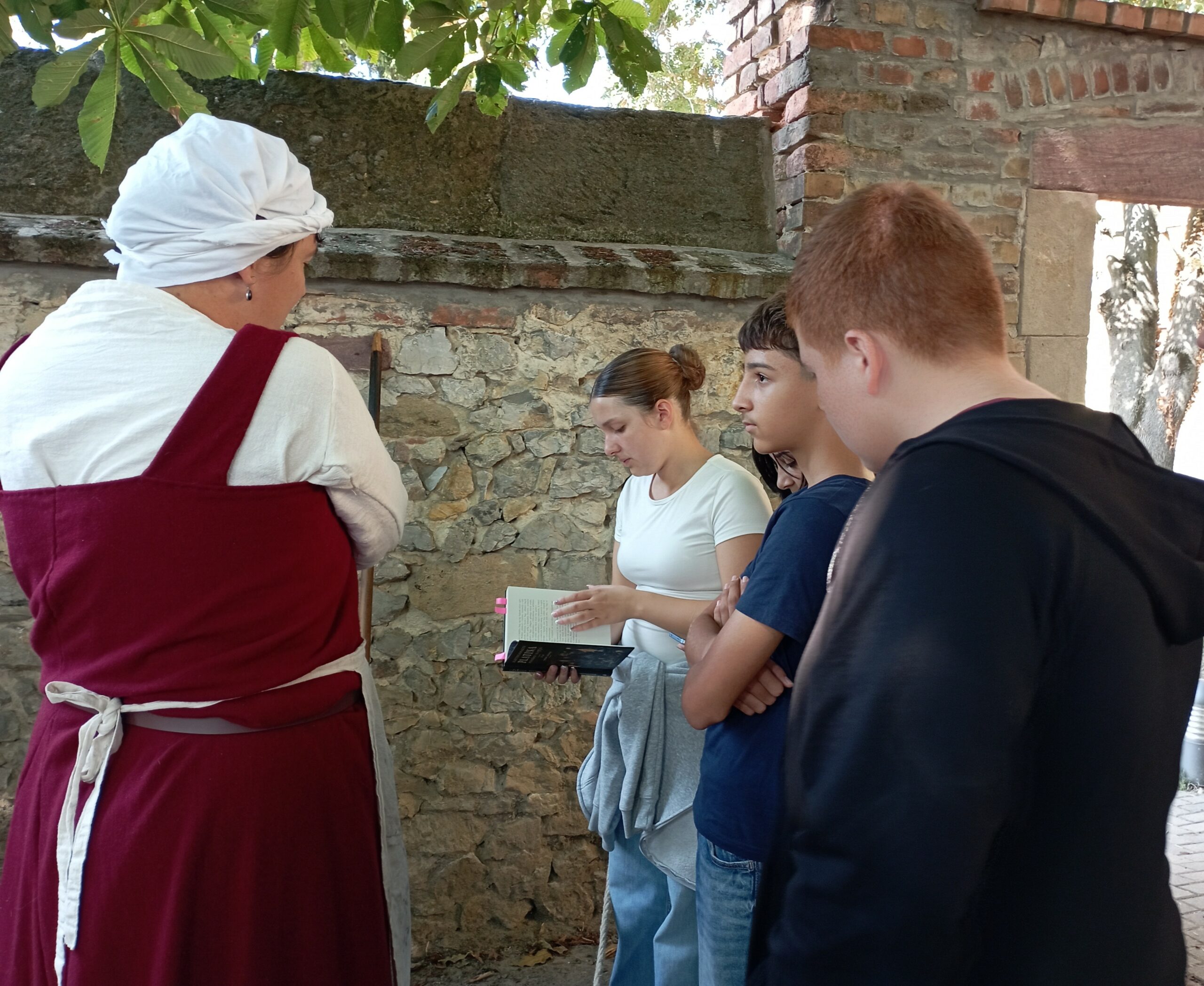 A megbeszélt találkozó helyre mindenki pontosan érkezett, majd utunk a Káptalan utcában lévő Janus Pannonius Múzeum Históriás udvara felé vezetett, ahol megelevenedett a középkori Pécs a Kereszt és félhold nevű rendezvényen. Megismerhettük a kor fegyvereit, viseleteit, a mindennapi élet eszközeit, és egy fegyverbemutatót is láthattunk.
