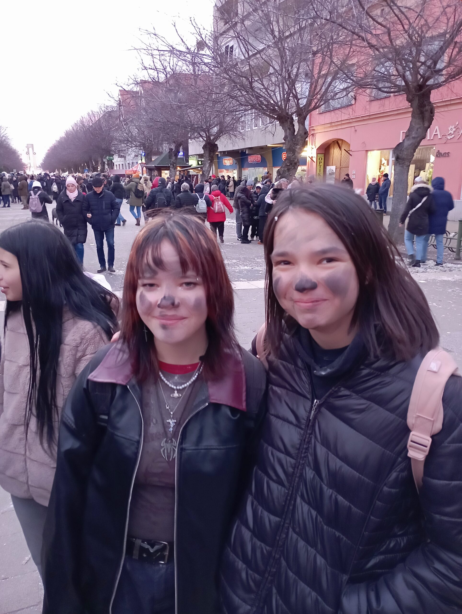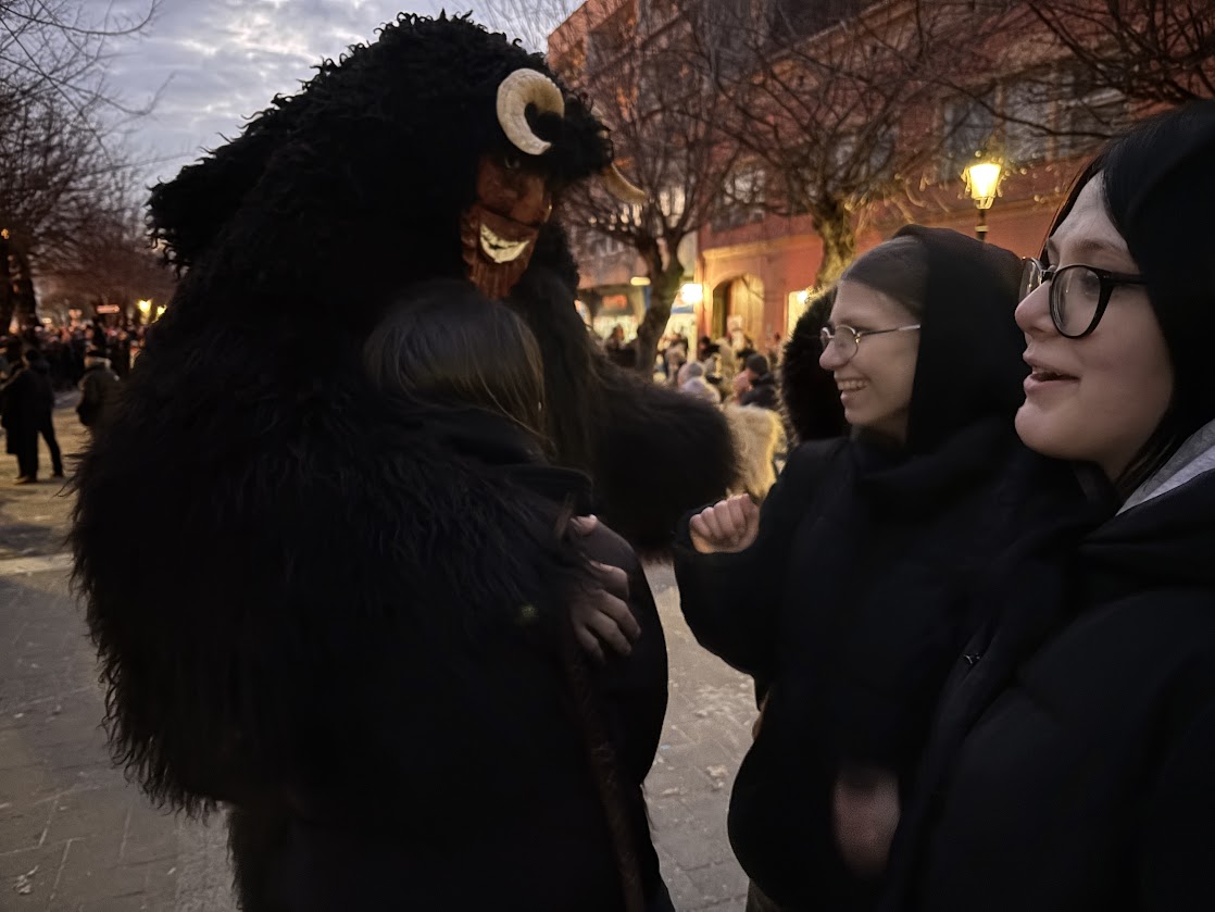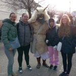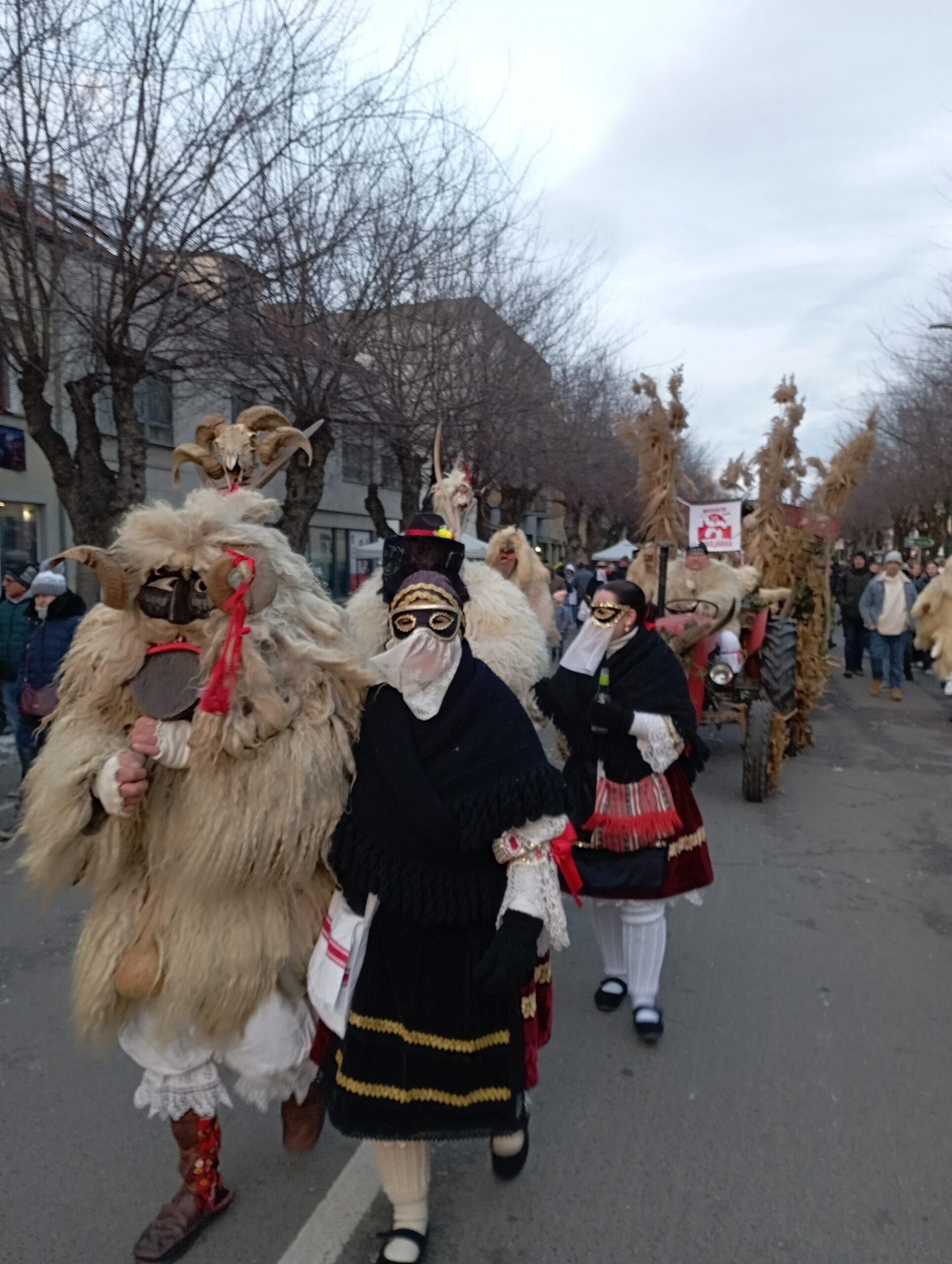 Miután végeztünk a múzeumban, közösen elsétáltunk a Duna partig, majd a Széchényi térig. Sikeresen bele sétáltunk a felvonulásba, így ízelítőt kaptunk a busók és jankelék farsangi forgatagából. Többen lisztes, madártollas hajjal és kormos arccal érték el a Széchényi teret, ahol megbeszéltük a későbbi találkozónk pontos helyét és idejét. Ezt követően szabad program következett, hogy mindenki a saját ritmusában fedezhesse fel a programokat és farsangolhasson a busókkal.