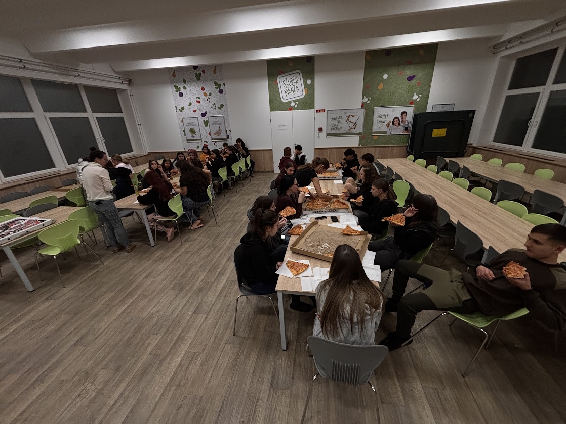 18 órakor, miután mindenki megérkezett a találkozási ponthoz, elindultuk a bérelt buszunk felé. A kollégiumba érve pizza volt vacsorára, aminek a gyerekek nagyon örültek.