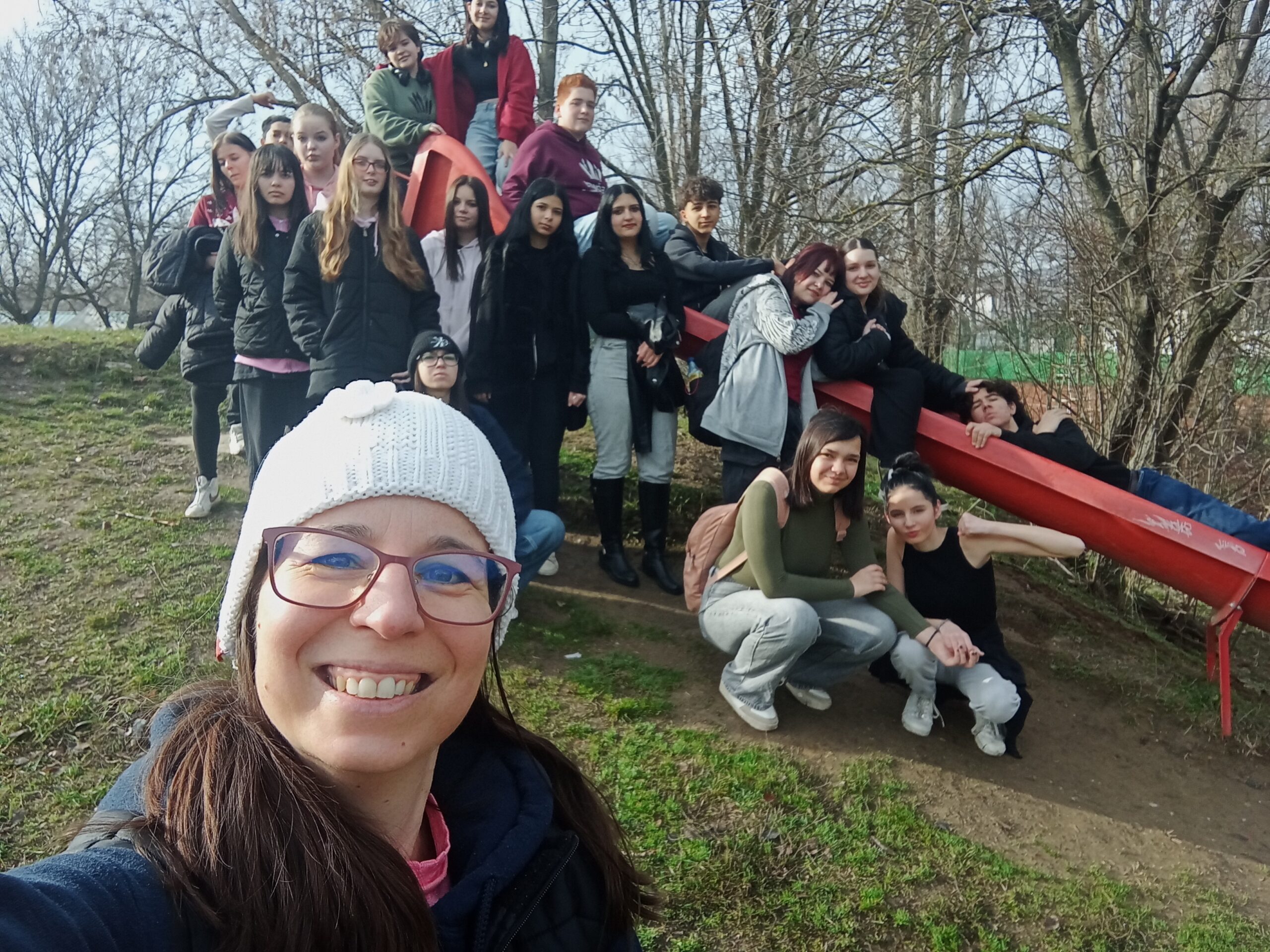 A korcsolyapálya felé sétálva, Bálint ötlete nyomán, összeálltunk egy rögtönzött csoportképre. Ritka, ha diák kezdeményezi a csoportkép készítését, így minden ilyen alkalmat igyekszek kihasználni. J