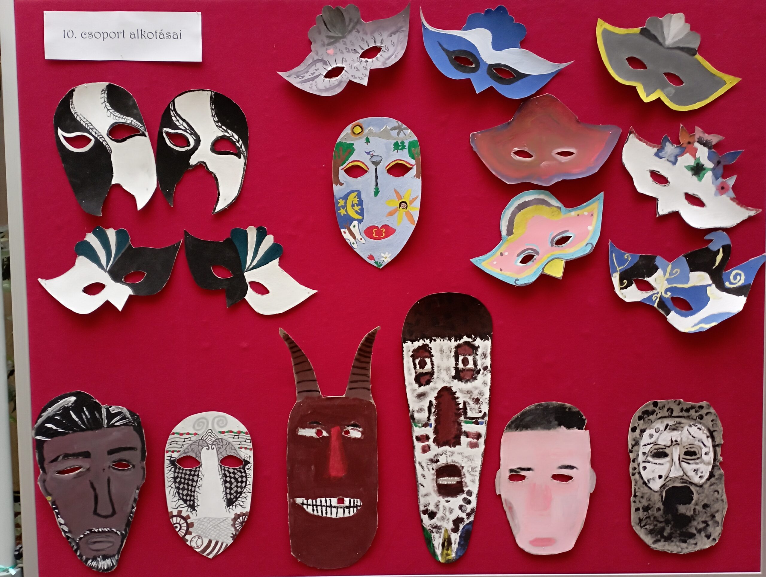 Az ebédet követően farsangi maszkokat készítettünk. A kollégiumi farsang jegyében többféle maszk sablonjai közül (pl.: busó, afrikai, velencei) választhattak a gyerekek, amit kartonon körbe rajzoltak, kivágtak, és a rajzolását követően, temperával kifestettek. A csoport megszavazta, hogy az elkészült farsangi maszkokat, a szerdai kollégiumi farsangon, kiállítjuk. A kezdeti kedvtelenséget felváltotta a művészi alkotás lendülete. Mindenki a saját munkájába mélyedve alkotta meg a saját maszkját. Nagyon ötletes, és kreatív alkotások születtek.
